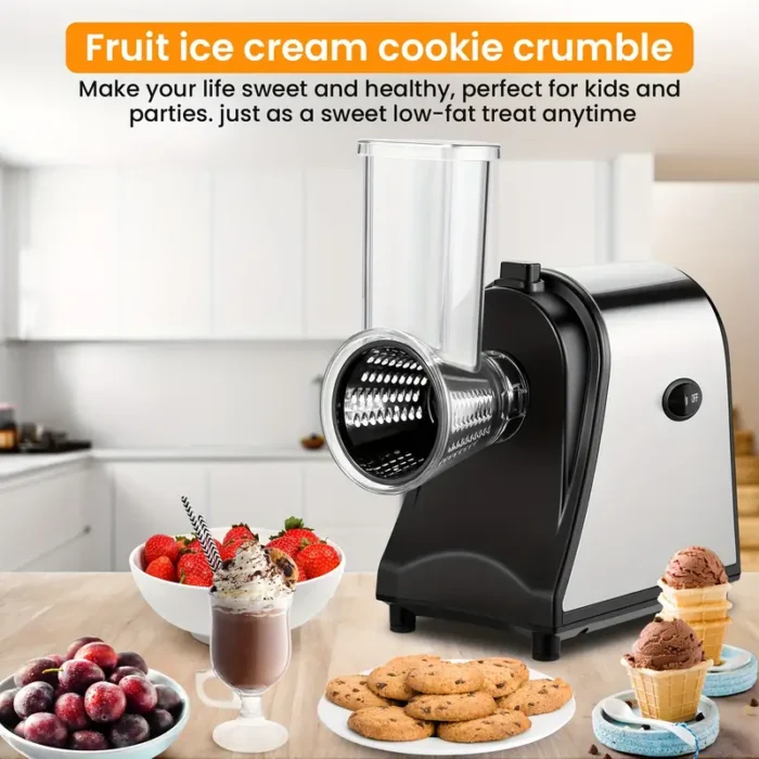 Package includes: 1 x Electric Vegetable Slicer 2 x Cutting Insert 1 x Fine Grating Insert 1 x Coarse Grating Insert 1 x Ground Blades 1 x User Manual