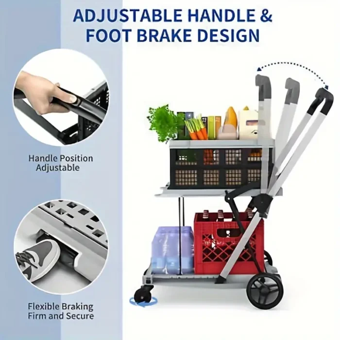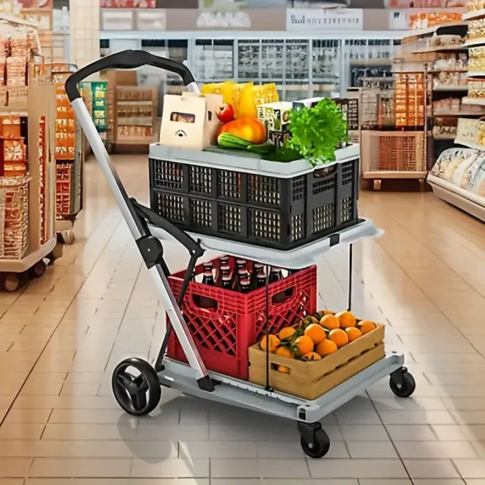 2-Tier Folding Shopping Cart Portable Utility Cart with 1 Storage Box, Rubber Wheels, 198 lbs Weight Capacity, with 360° Swivel Wheels