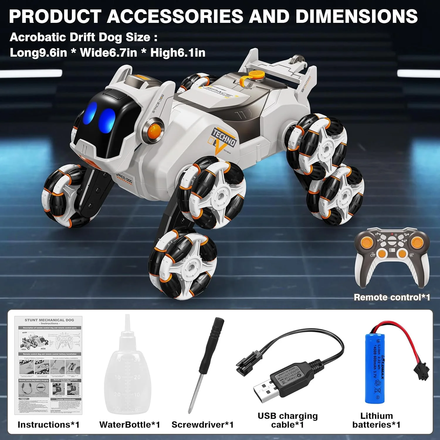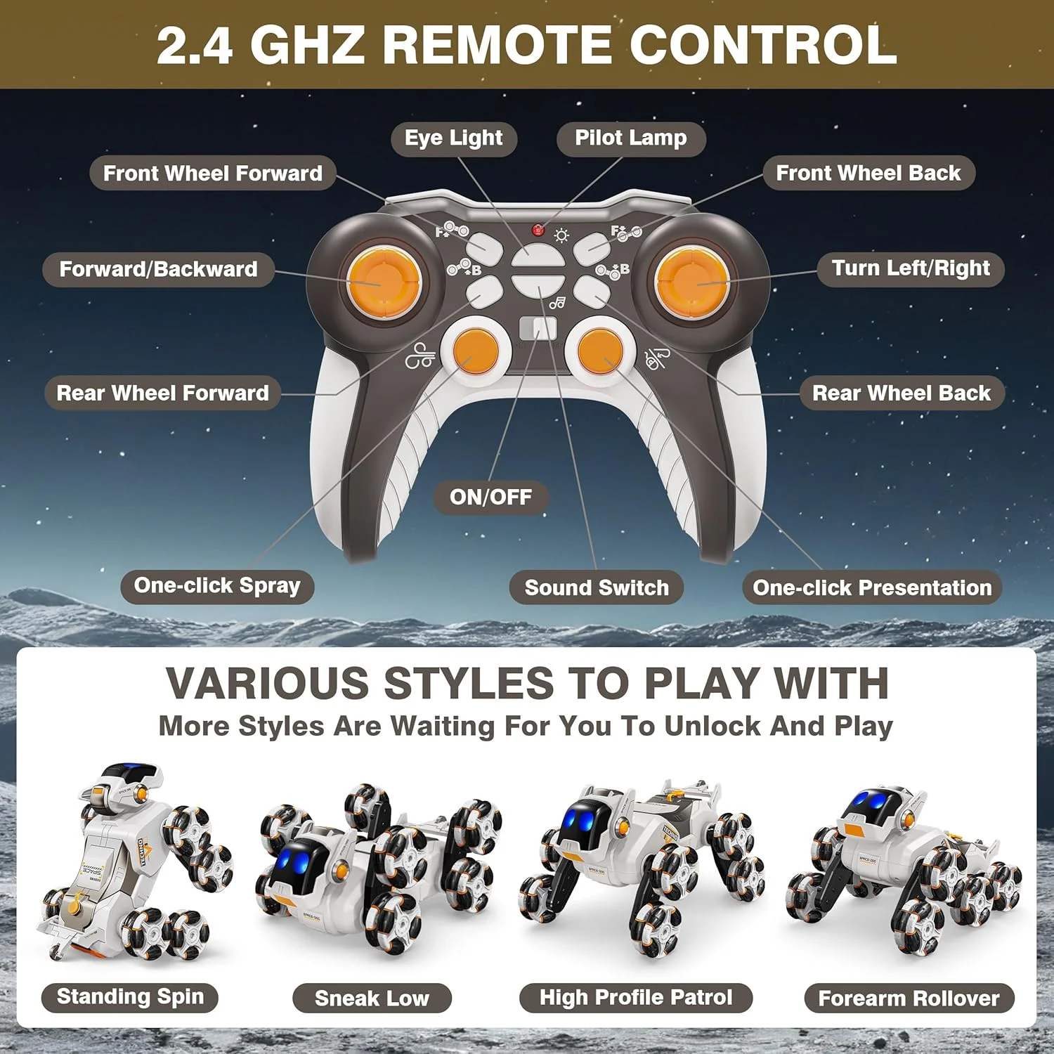 8WD Remote Control Stunt Car: The cool 2.4GHz remote control robot dog car is equipped with eight wheels. In addition to the basic forward and backward movements, it can also easily perform 360 ° turn, crawl, drift and other stunts.